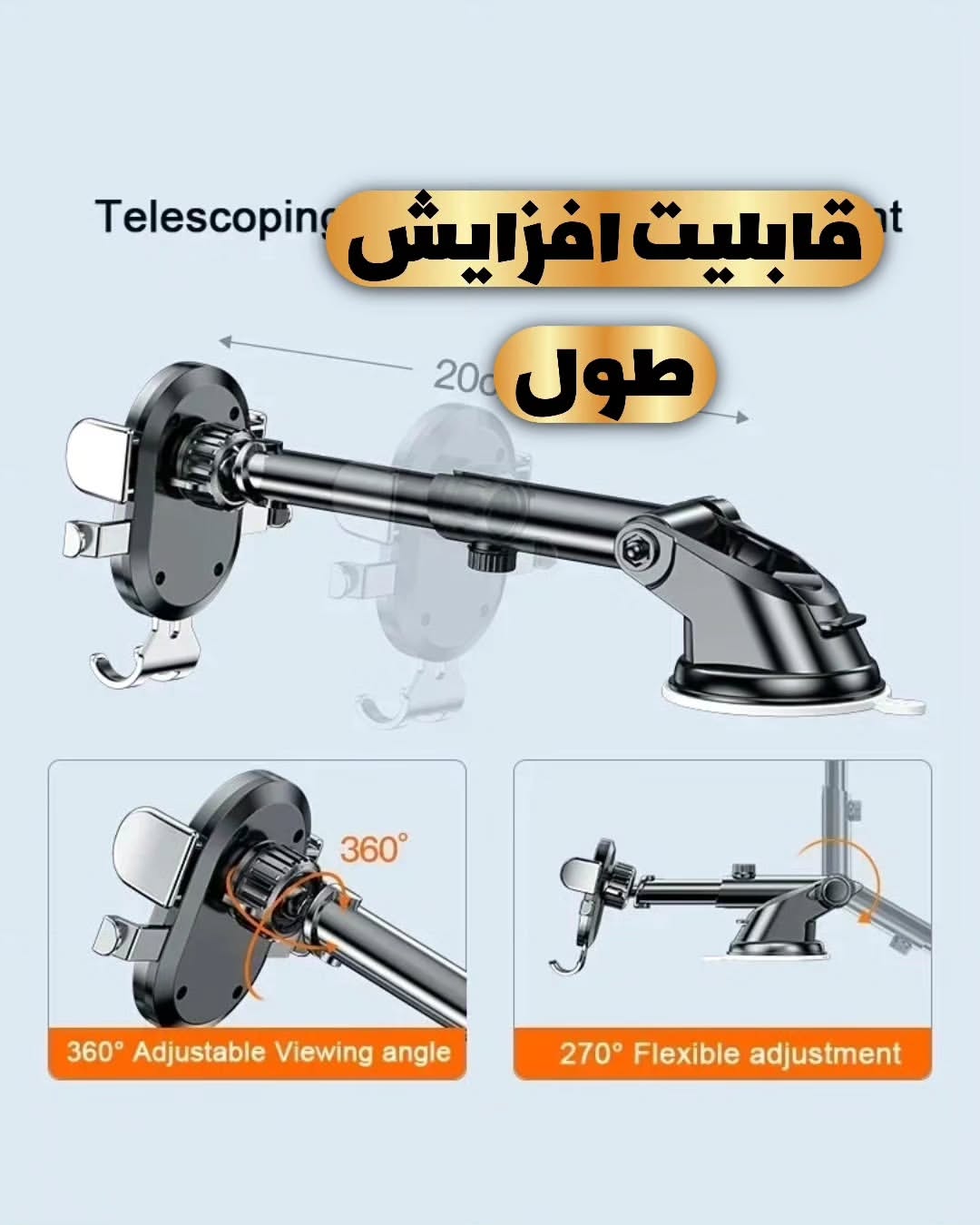 قابل نصب بر روی داشبورد و شیشه چسبندگی و استحکام بی نظیر متریال ABS درجه یک قابلیت تنظیم طول ، ارتفاع و زاویه عالی